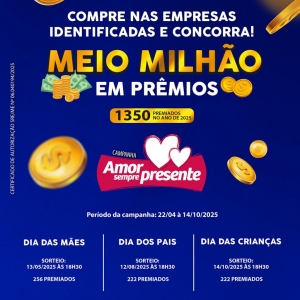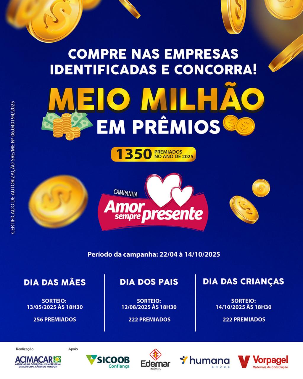 A campanha “Amor Sempre Presente” é realizada pela Acimacar em parceria com as empresas do comércio de Marechal Cândido Rondon. Ela é legalizada pela Secretaria de Acompanhamento Fiscal, Energia e Loterias (Sefel) do Ministério da Fazenda e conta com o patrocínio de Edemar Imóveis, Sicoob Confiança, Humana Saúde e Vorpagel Materiais de Construção.
