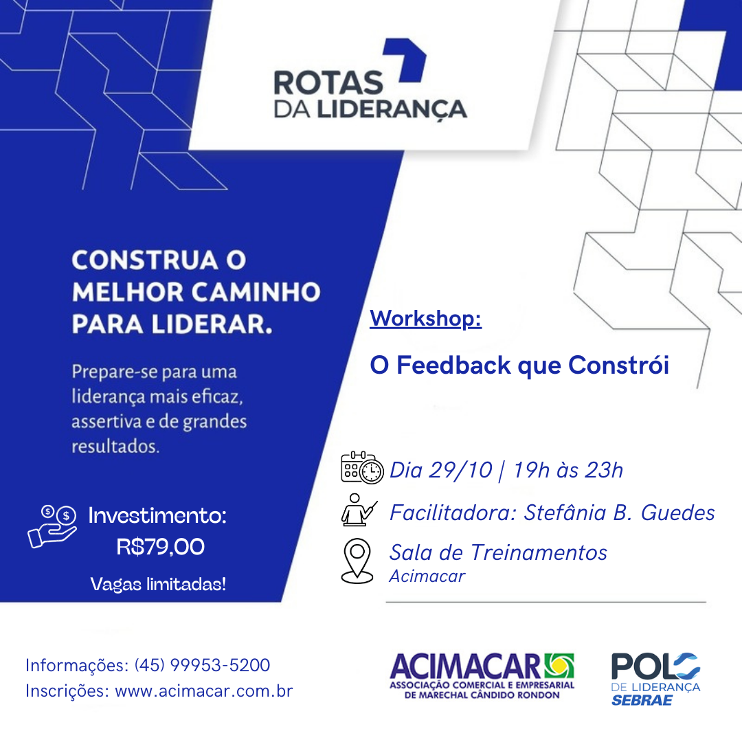 O Sebrae oferece o workshop "O Feedback que Constrói", focado em ensinar como dar e receber feedbacks de forma positiva e construtiva, para que o processo se torne uma ferramenta poderosa no desenvolvimento da equipe e na melhoria contínua dos relacionamentos interpessoais.
