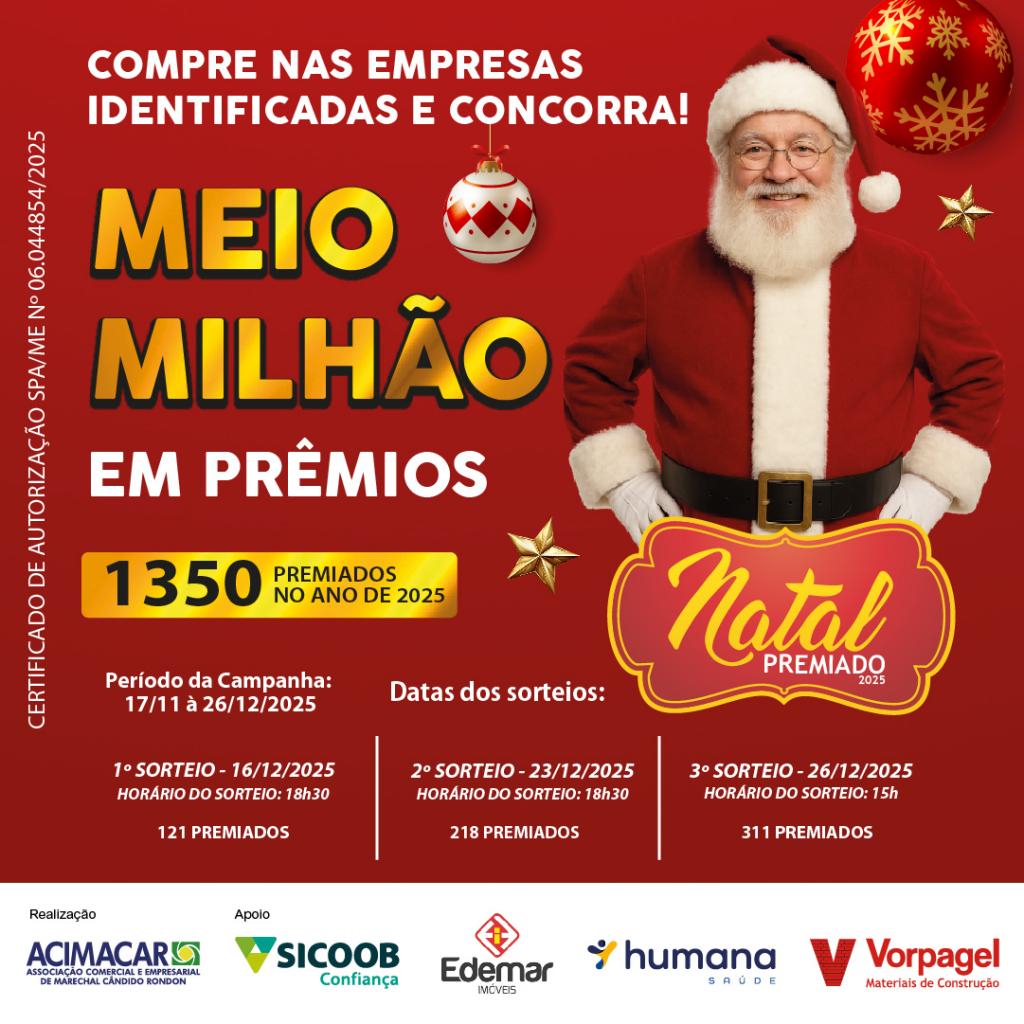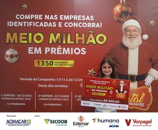 A Associação Comercial e Empresarial de Marechal Cândido Rondon (Acimacar) realiza nesta terça-feira (23) o segundo sorteio da Campanha Natal Premiado Acimacar 2025.