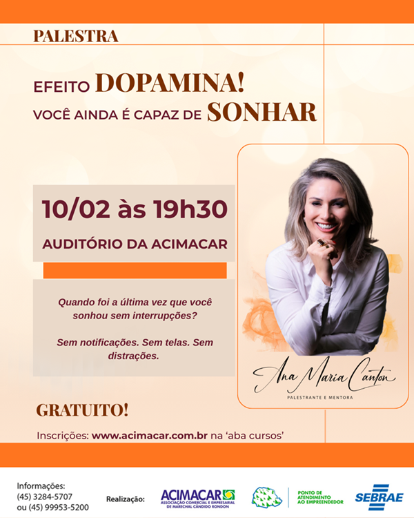 Com o tema “Efeito dopamina – você ainda é capaz de sonhar”, o encontro acontece no Auditório Dirceu da Cruz Vianna, na sede da entidade, a partir das 19 horas e propõe uma reflexão sobre o ritmo acelerado da vida moderna, o excesso de estímulos e a dificuldade de manter conexão com propósito, equilíbrio e sonhos pessoais e profissionais.